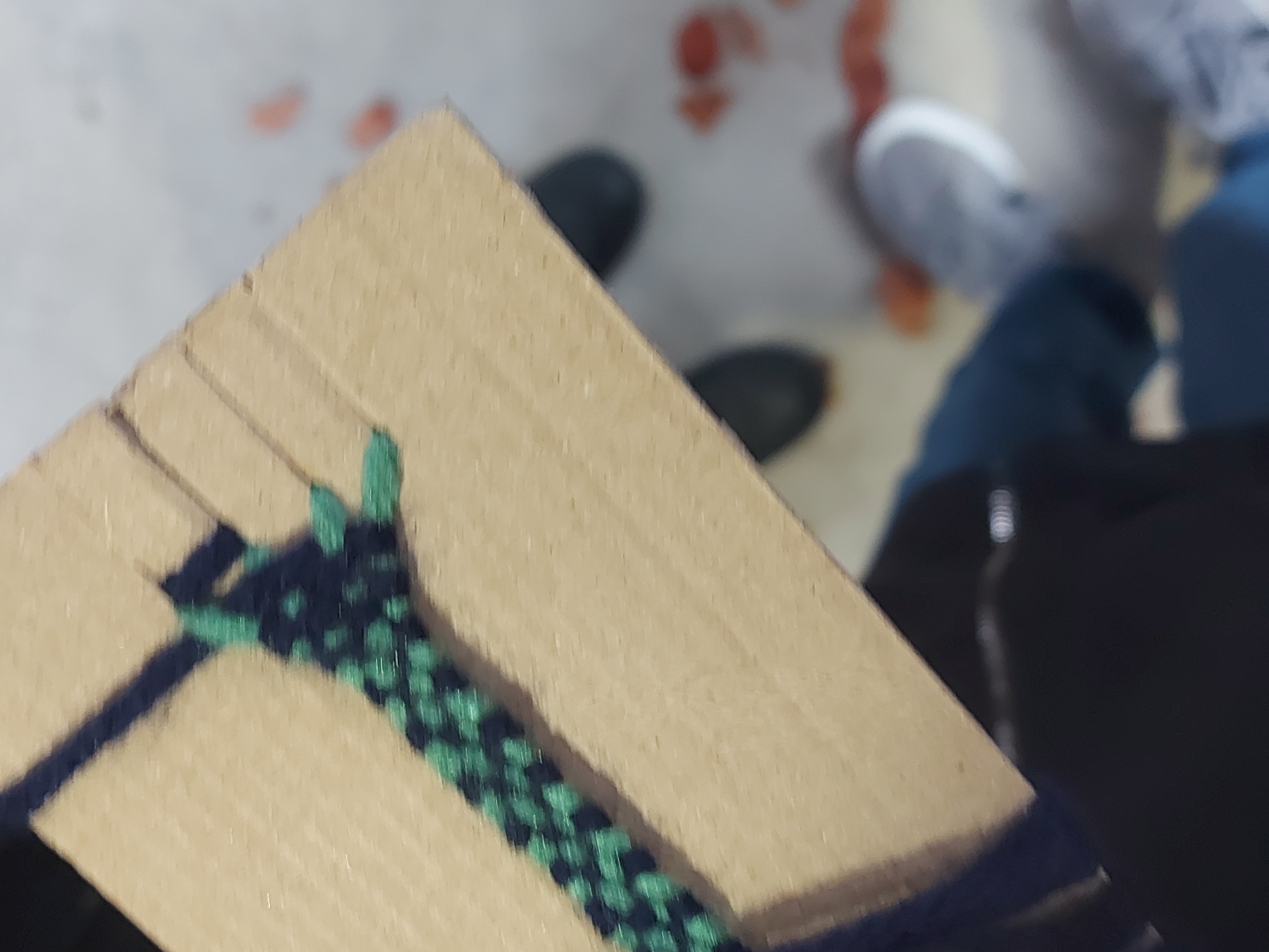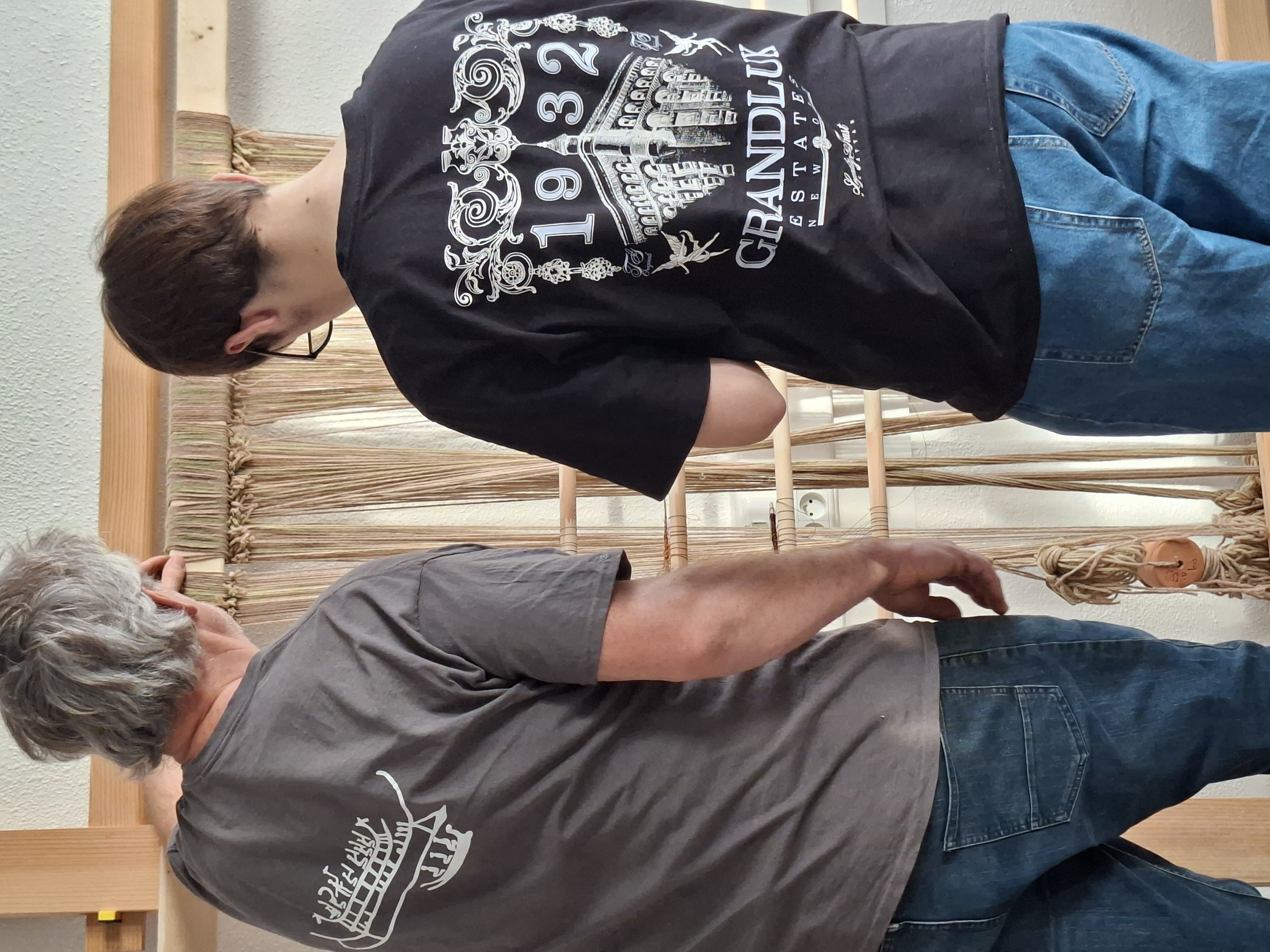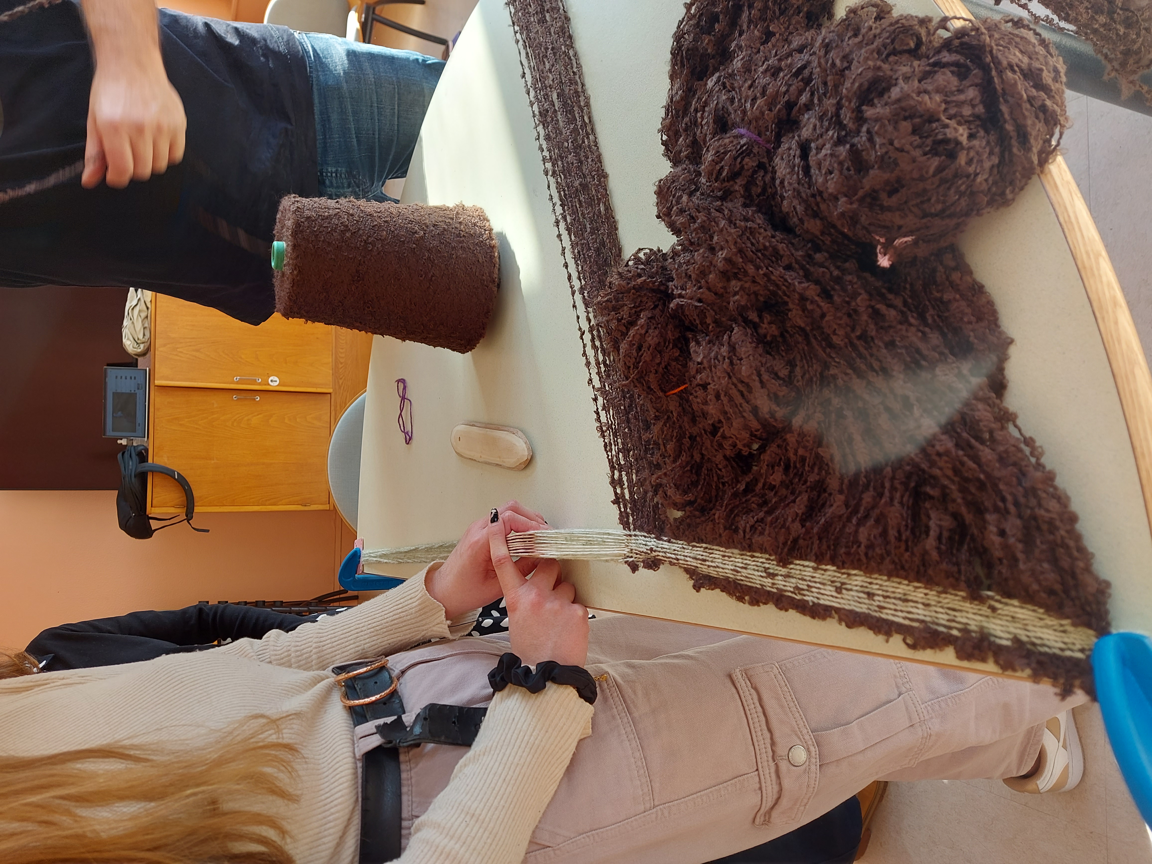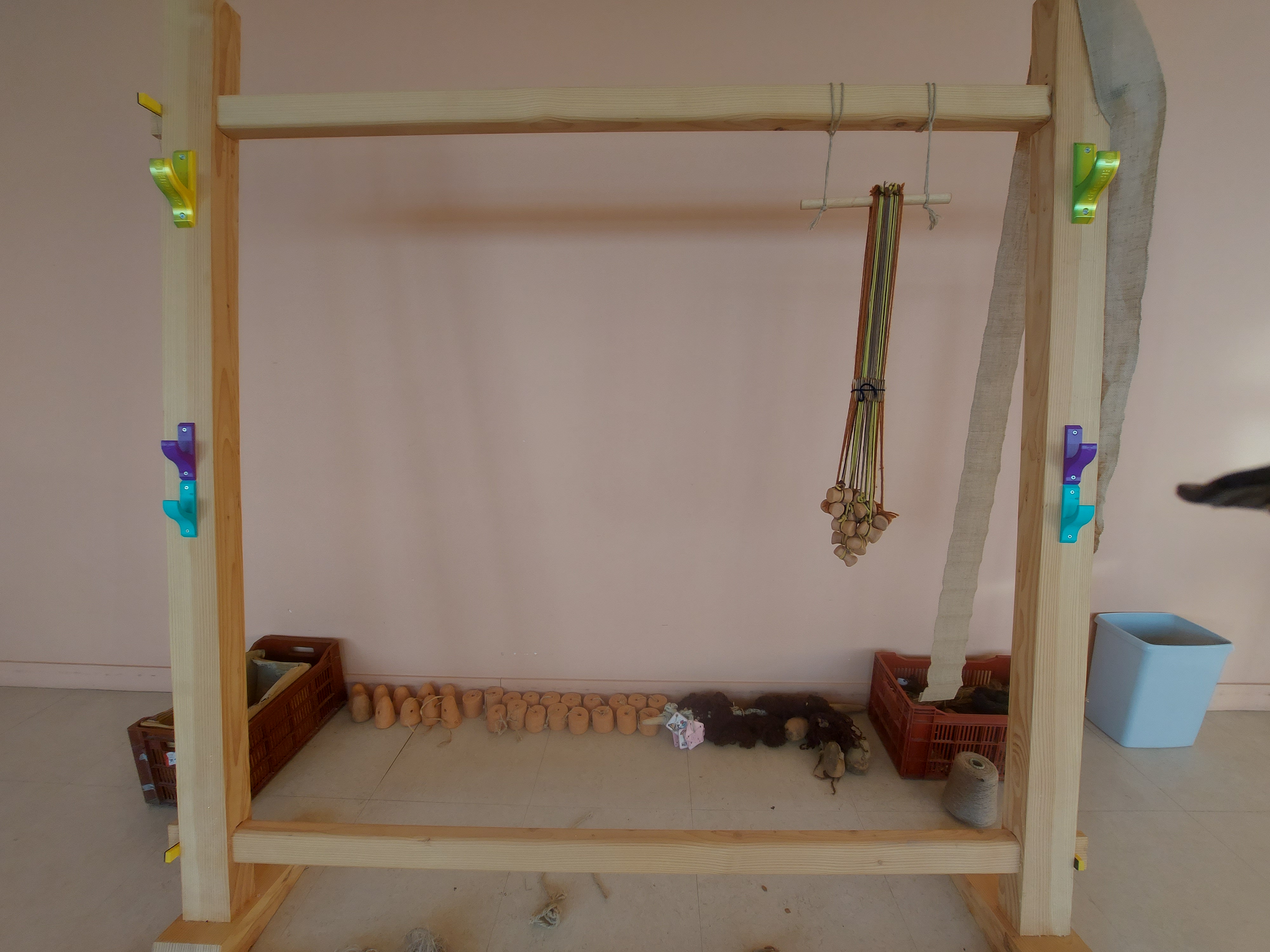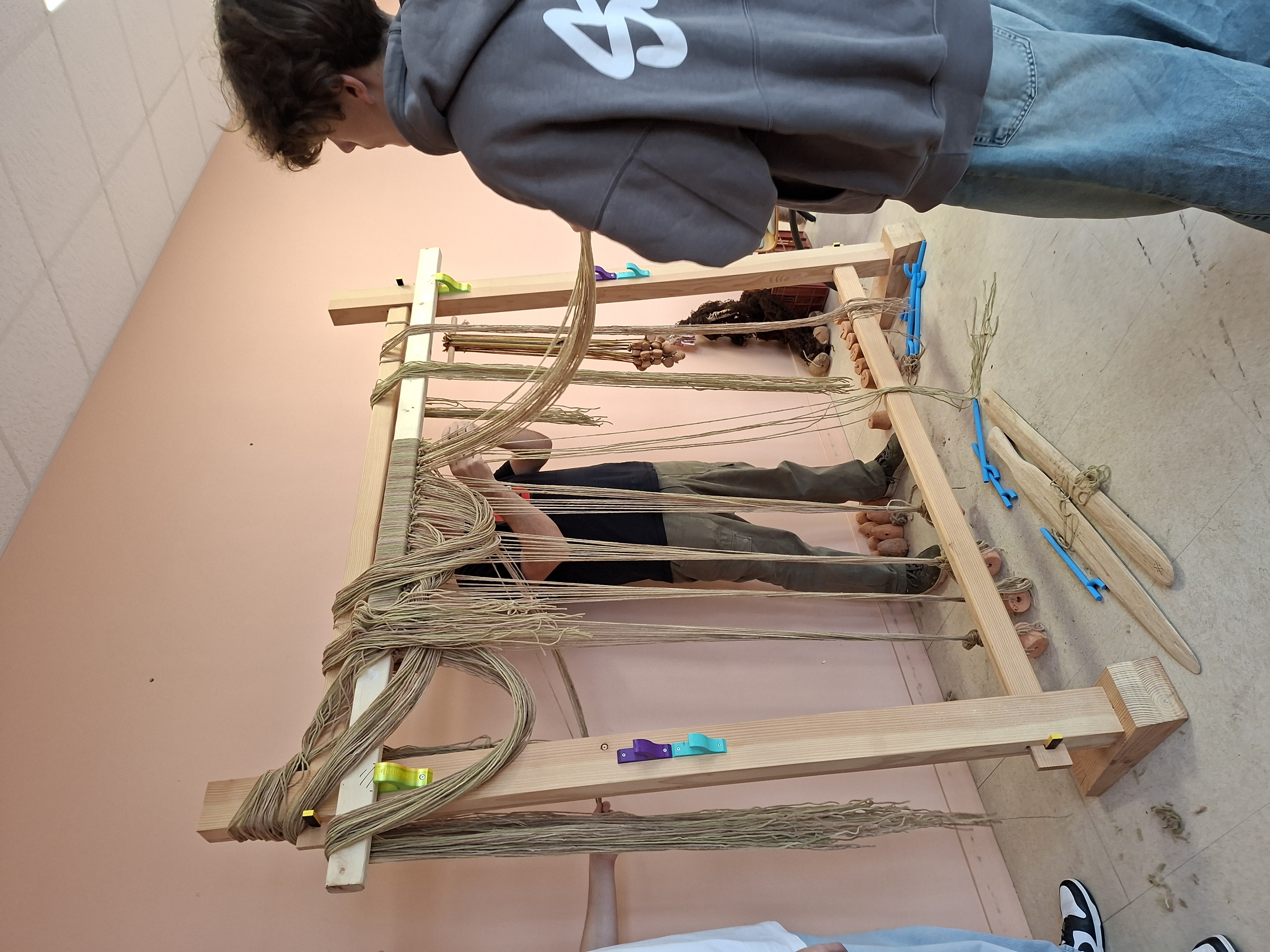 Installation de la structure pour un 1er essai d'ourdissage avec les élèves sur un métier à 1 barre (le projet sera finalement plus ambitieux puisque l'année 2 partira sur un métier à tisser à 4 barres pour produire une pièce de tissu plus élaborée avec motif):