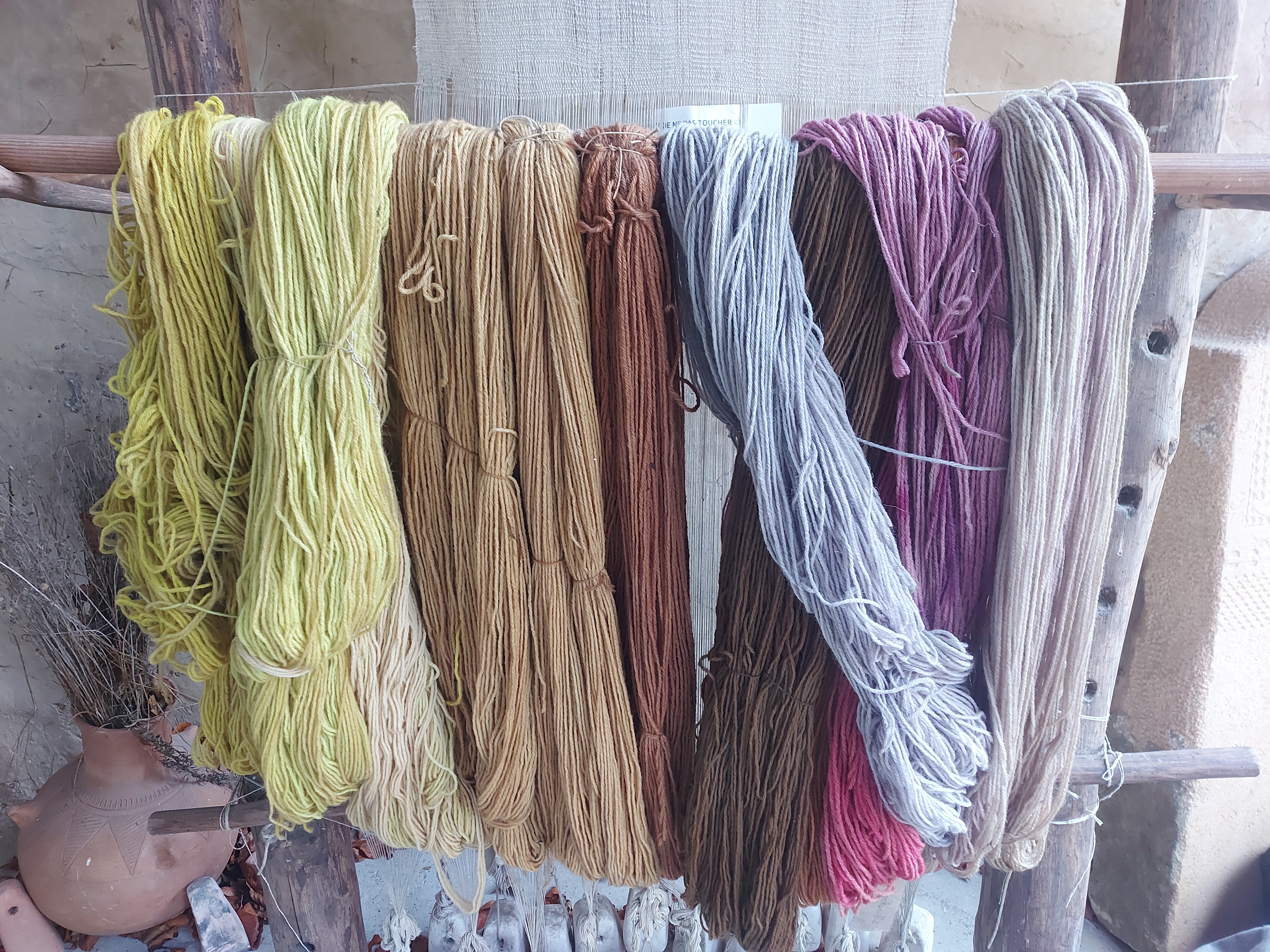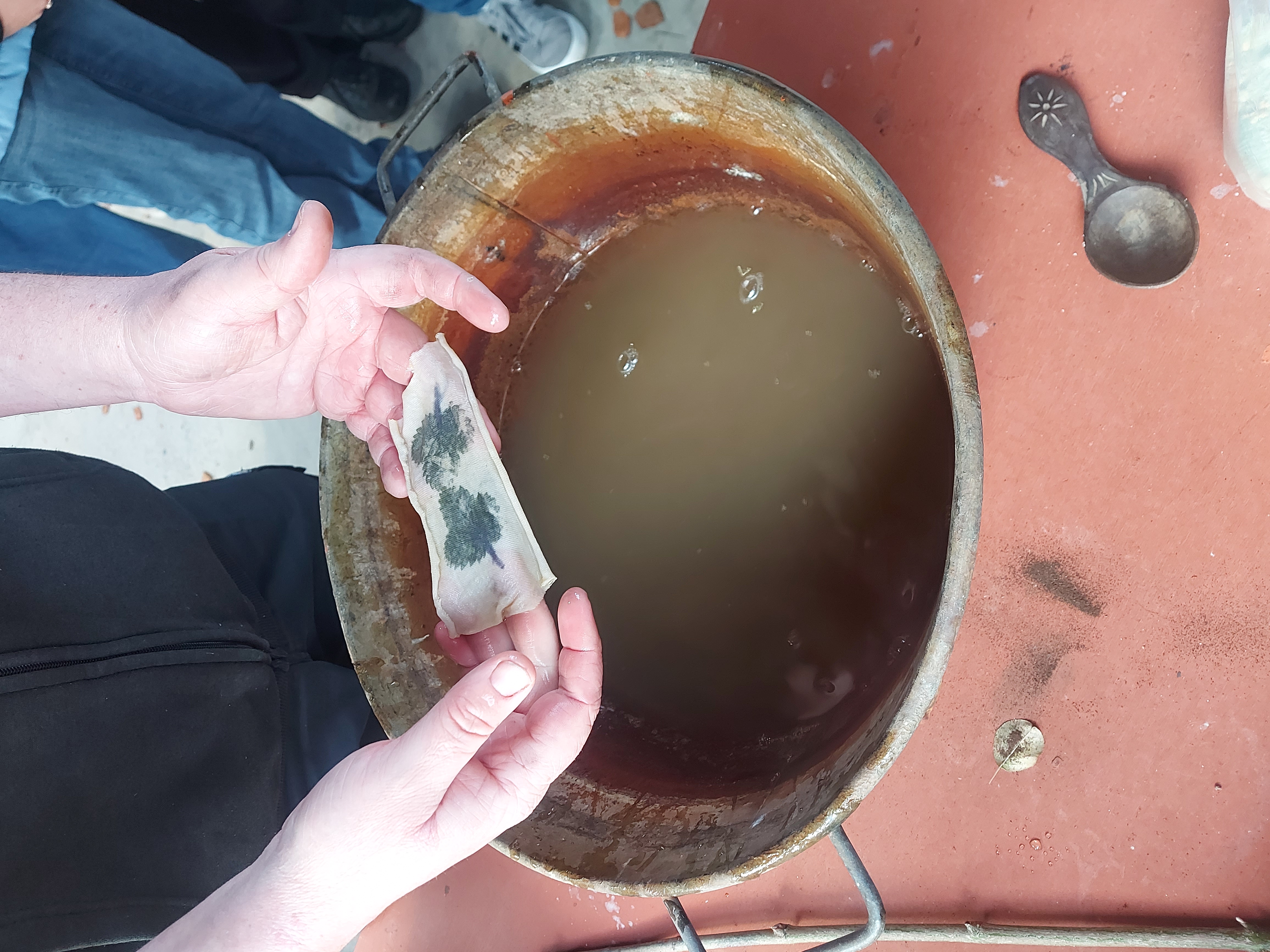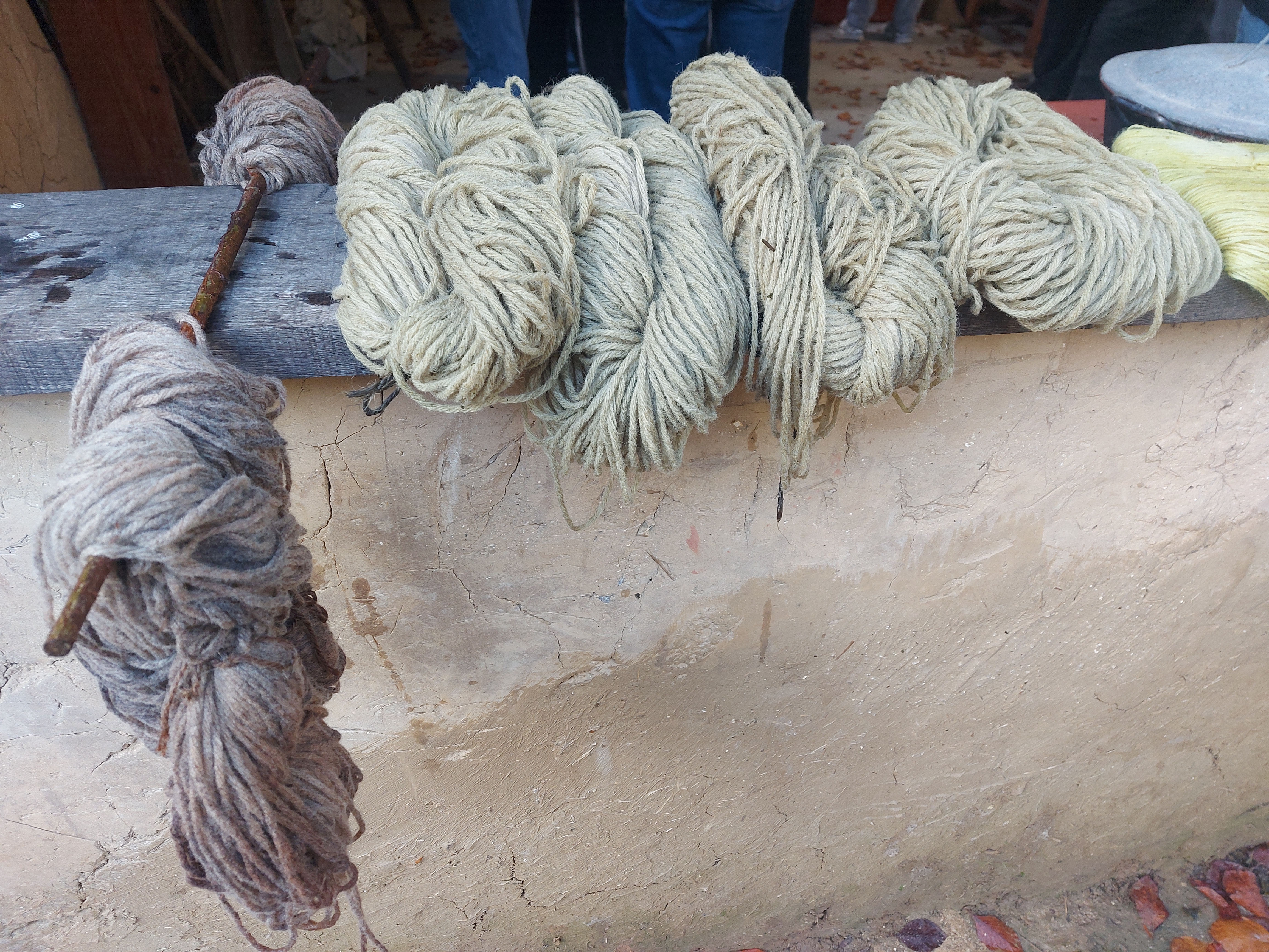 Séance sur le site de Samara: initiation aux techniques de teintures végétales: les fils qui vont être installés sur le métier à tisser pour la production finale seront ici teintés à la gaude et au brunois: