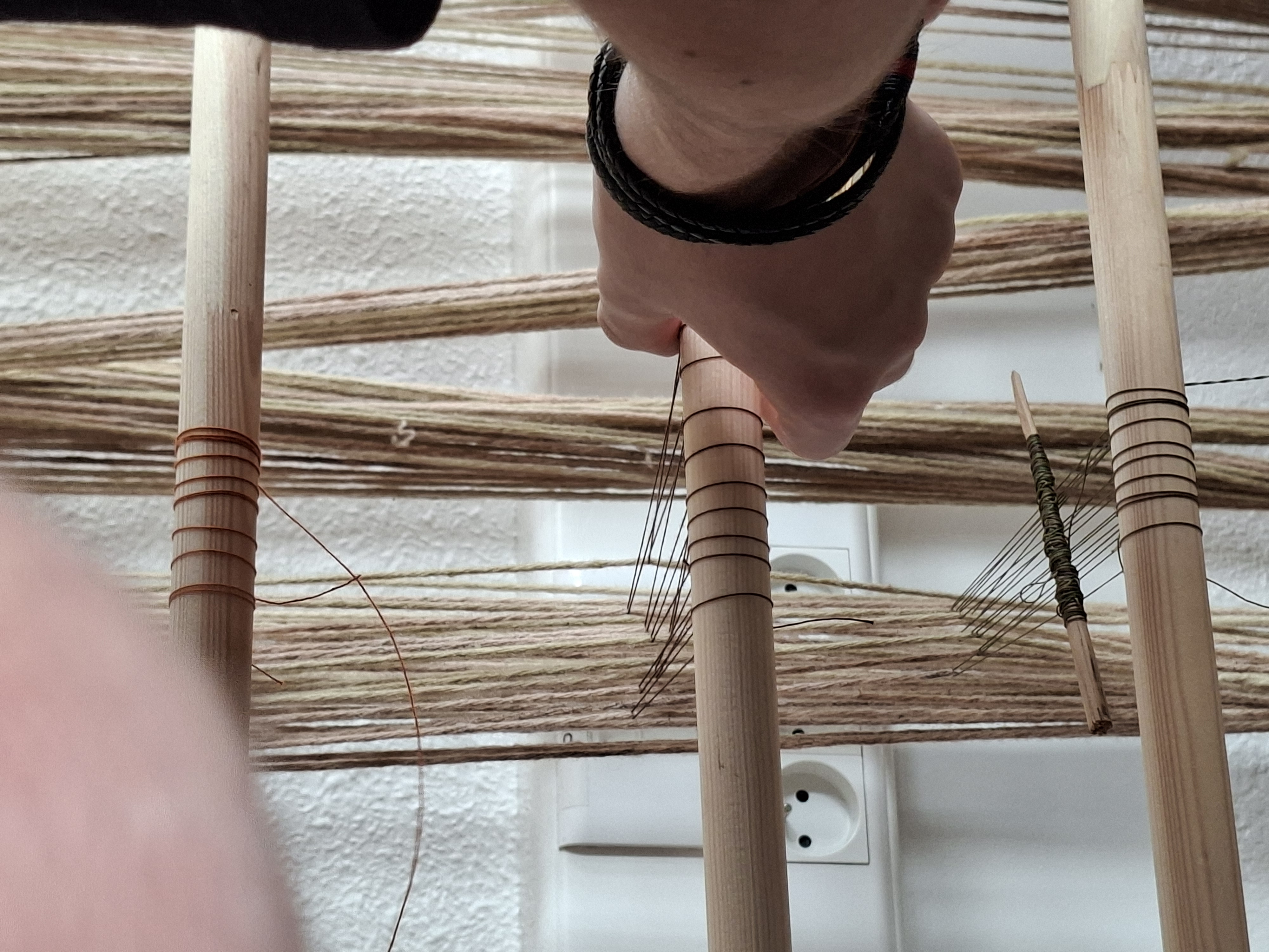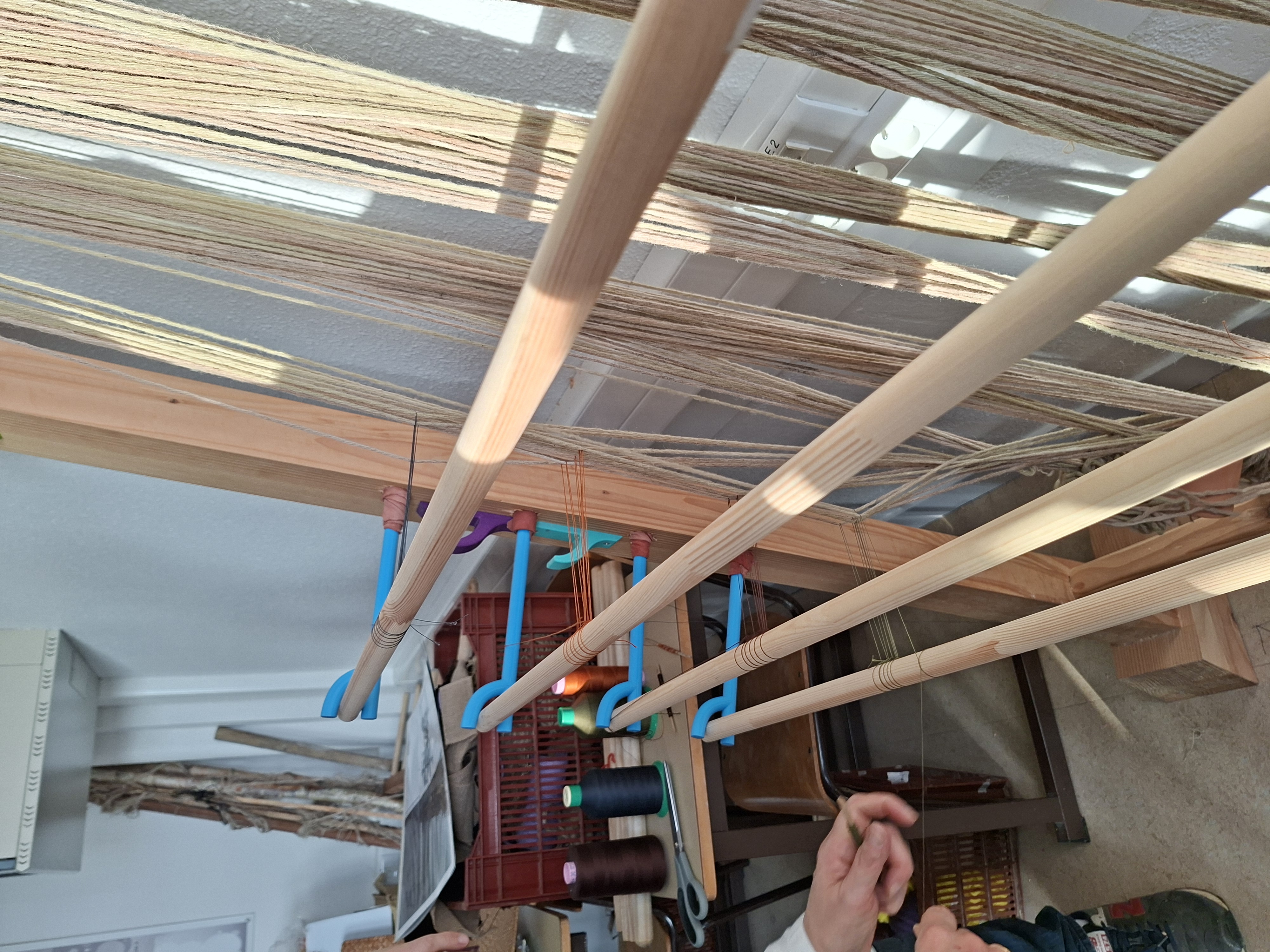 Arrivée du métier à tisser au K et ourdissage version 2 avec répartition des fils sur les barres de lice