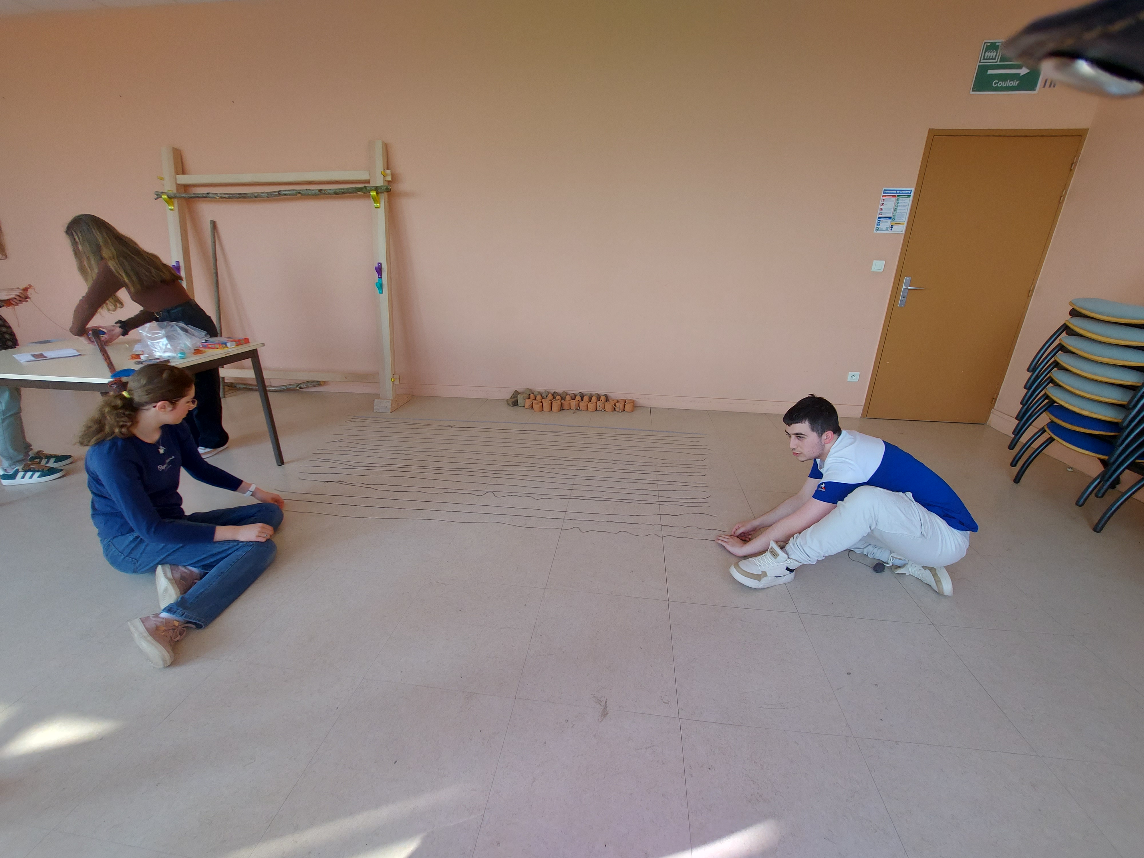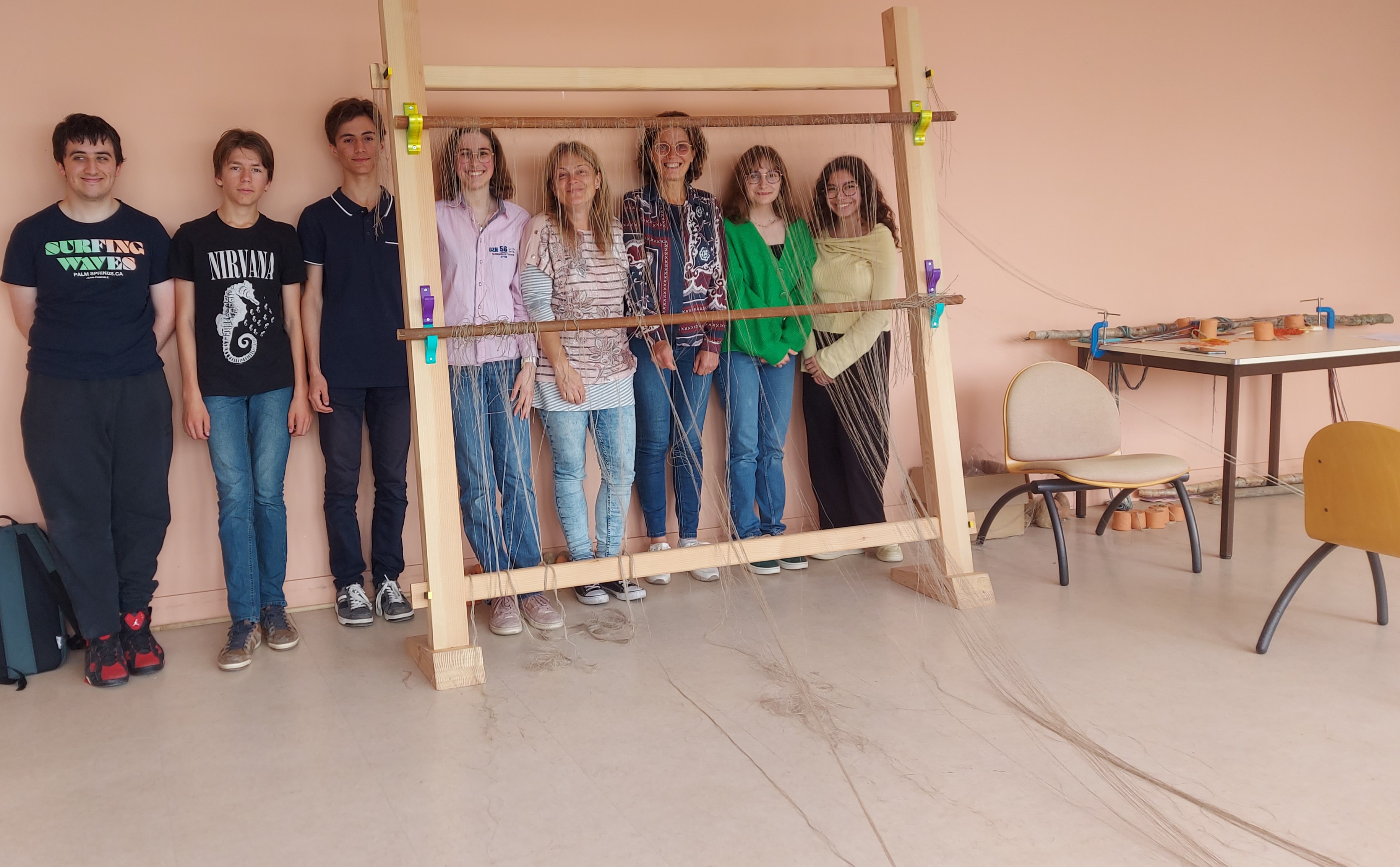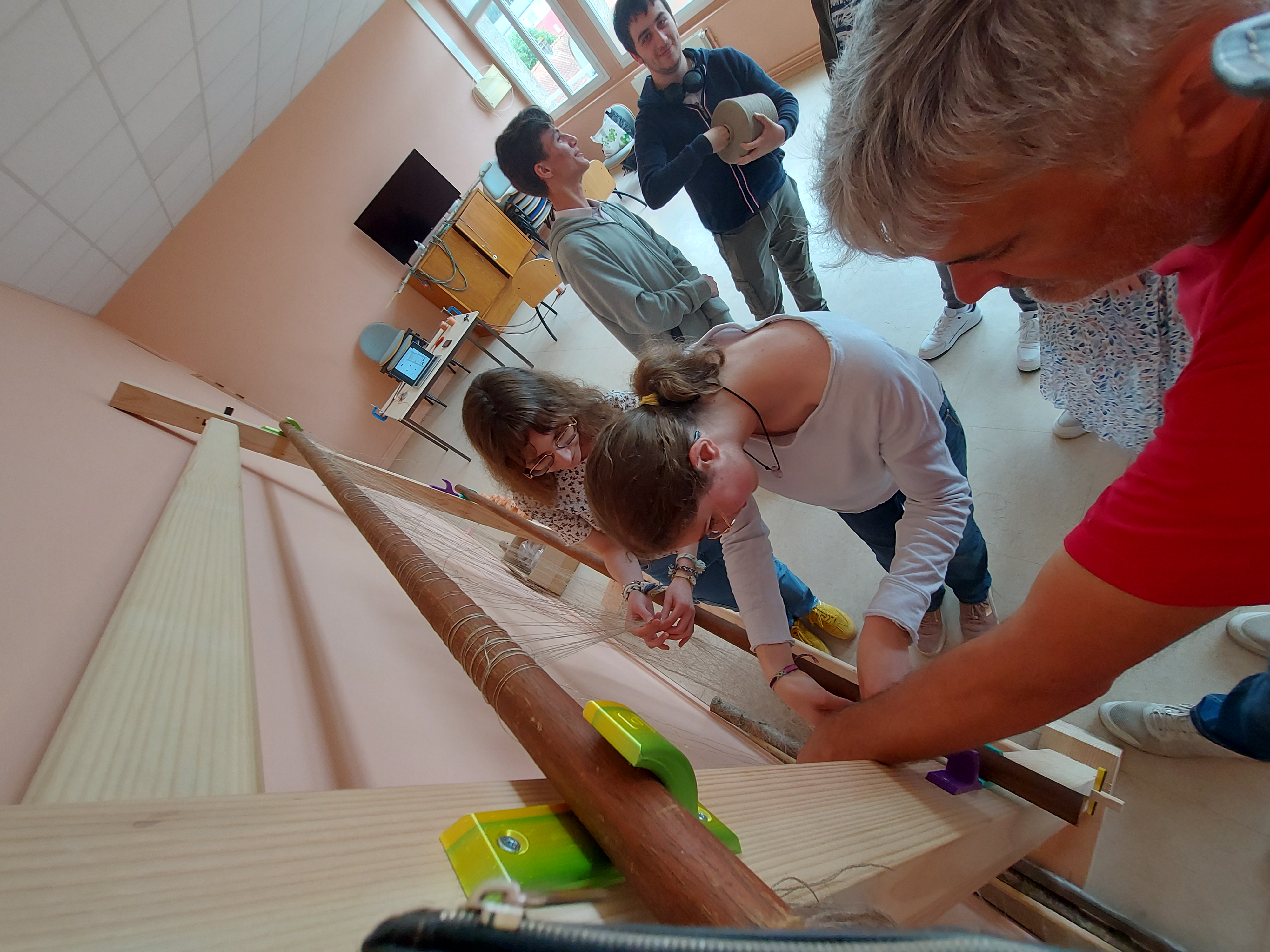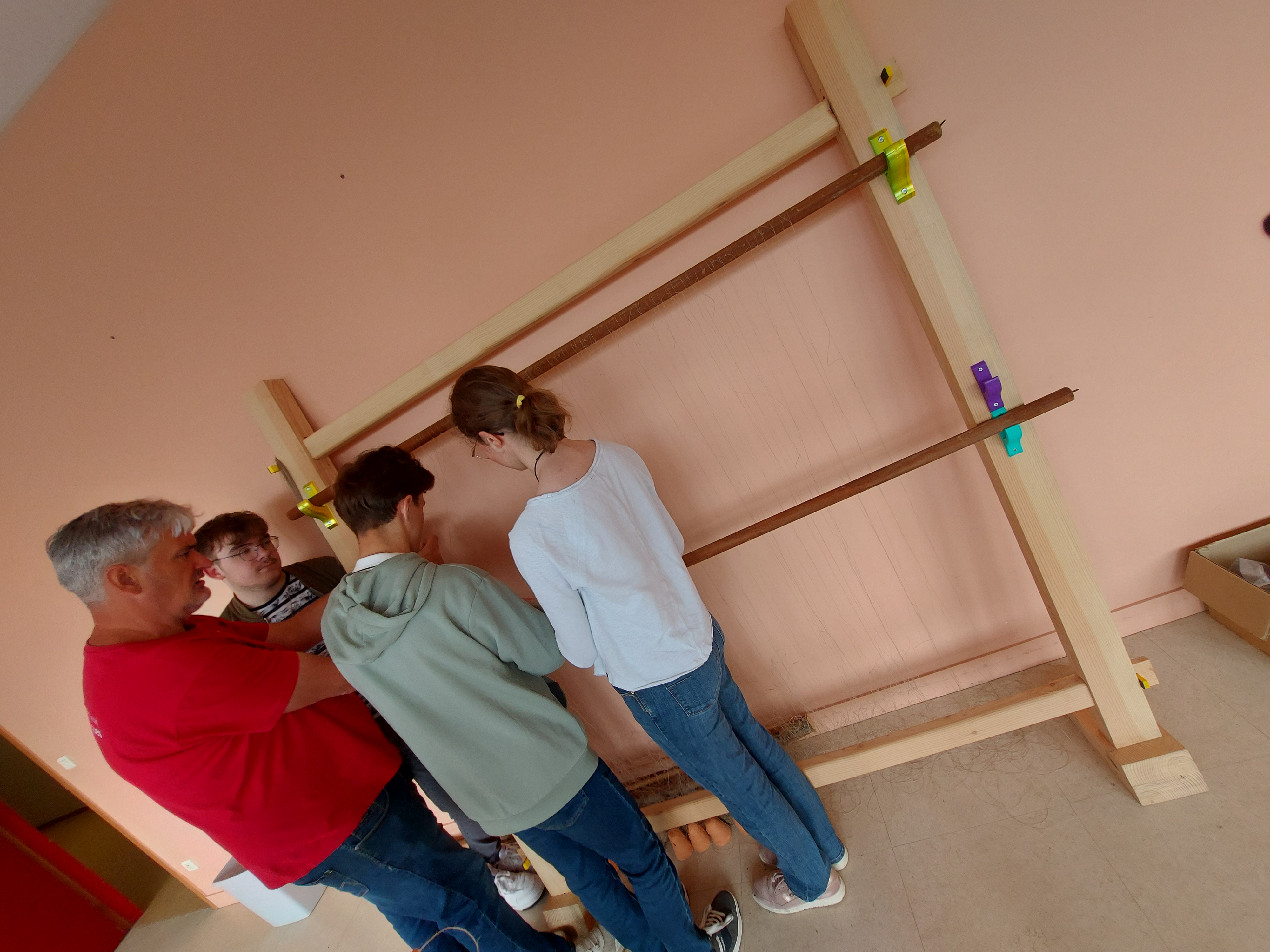 Installation de la structure pour un 1er essai d'ourdissage avec les élèves sur un métier à 1 barre (le projet sera finalement plus ambitieux puisque l'année 2 partira sur un métier à tisser à 4 barres pour produire une pièce de tissu plus élaborée avec motif):