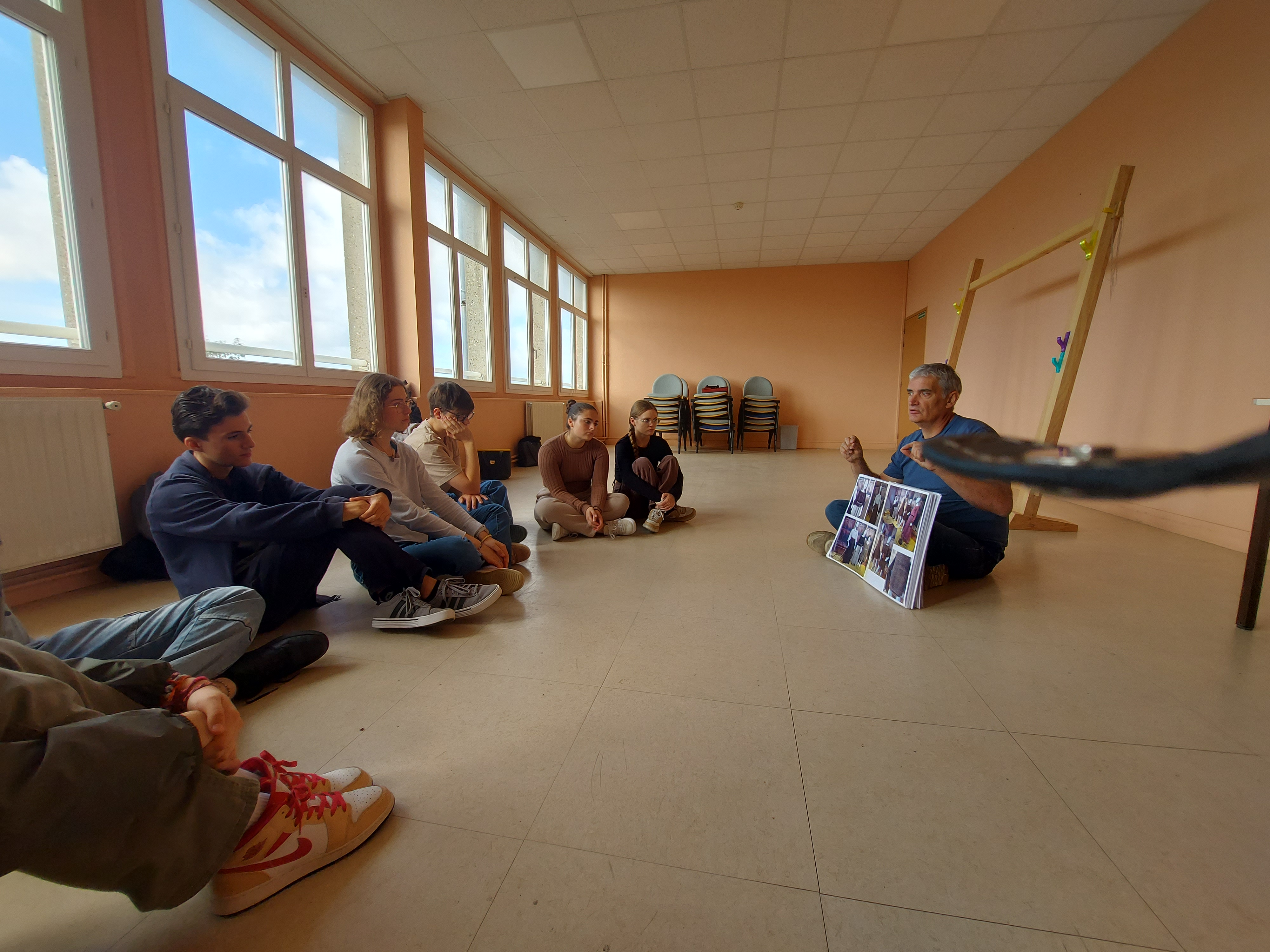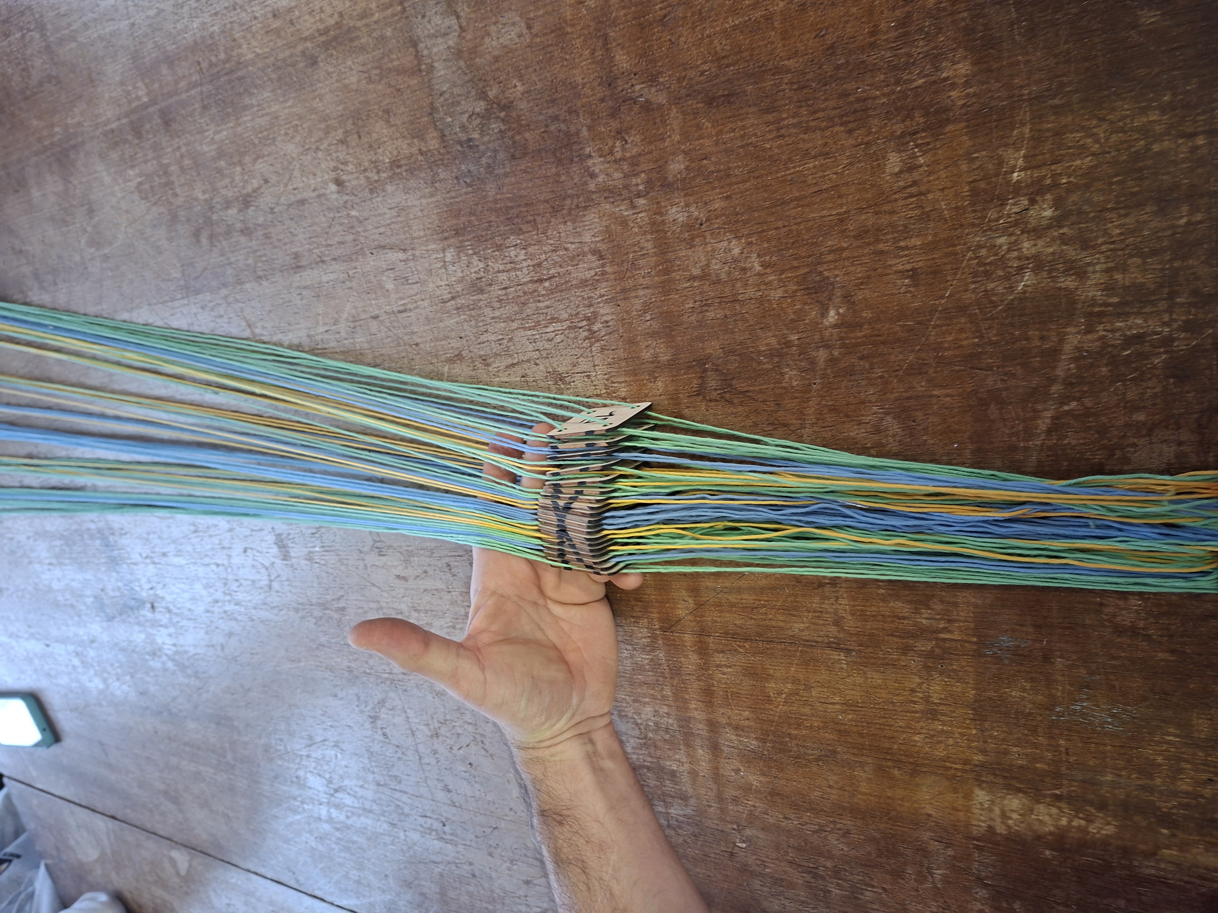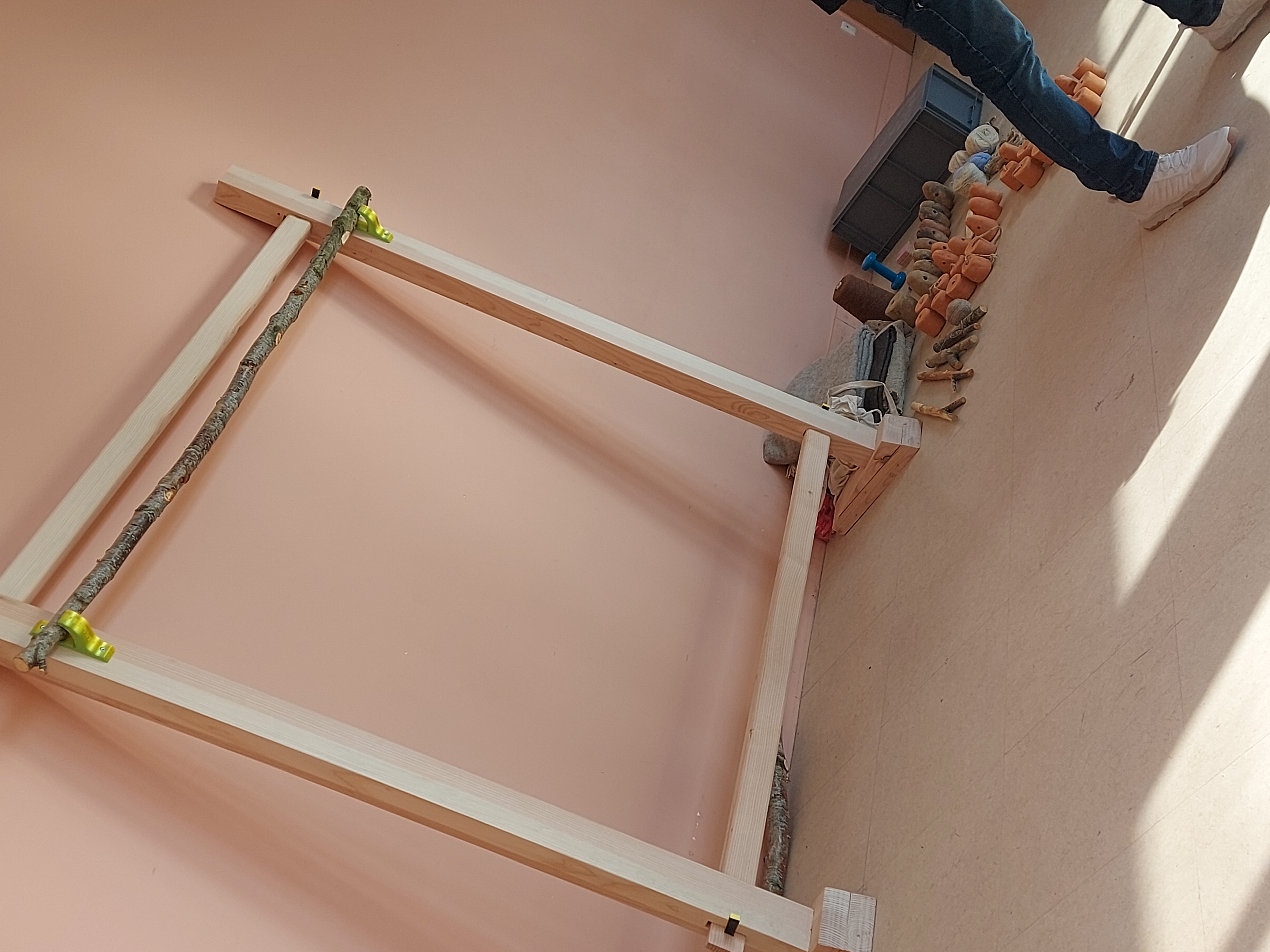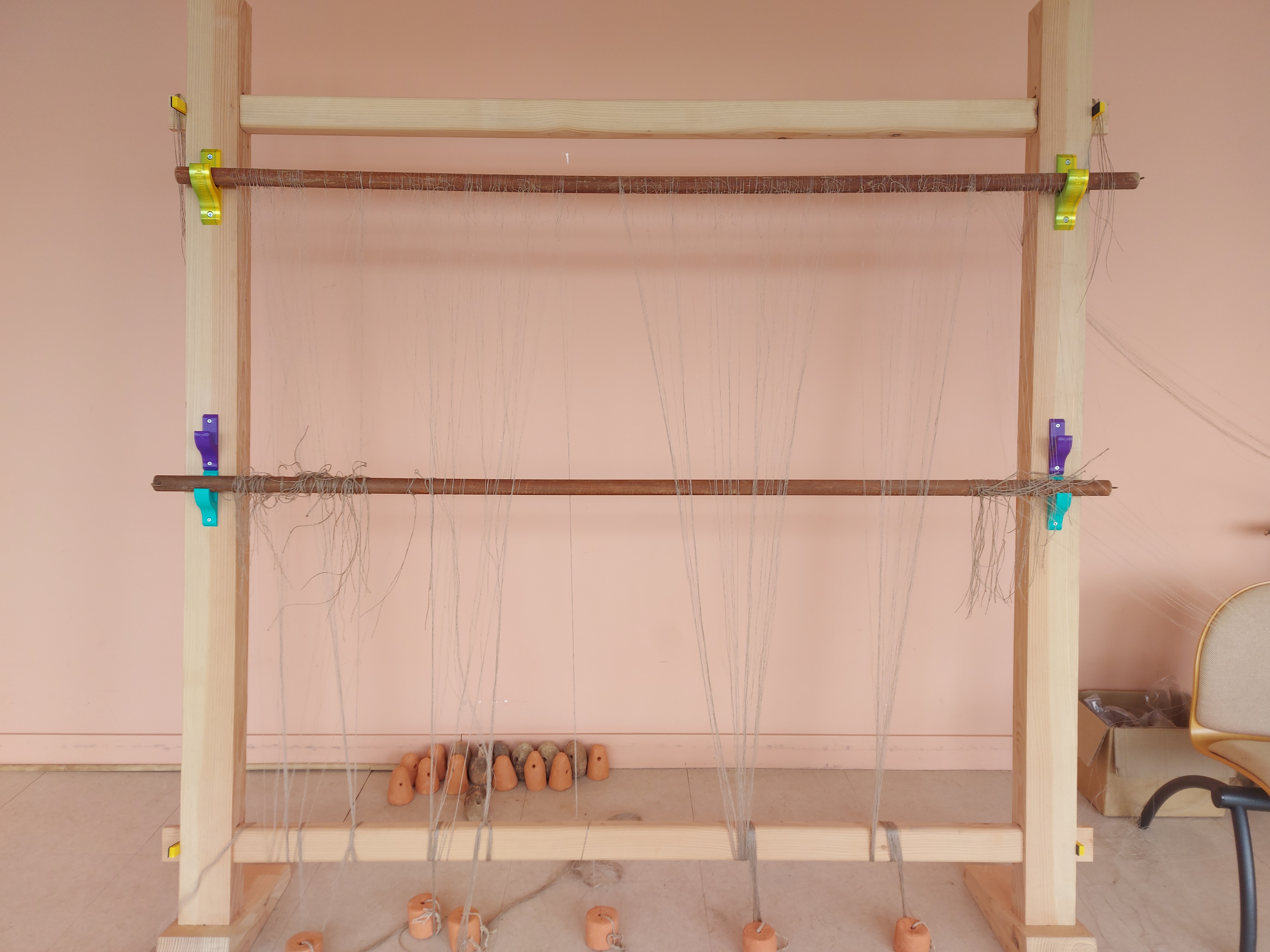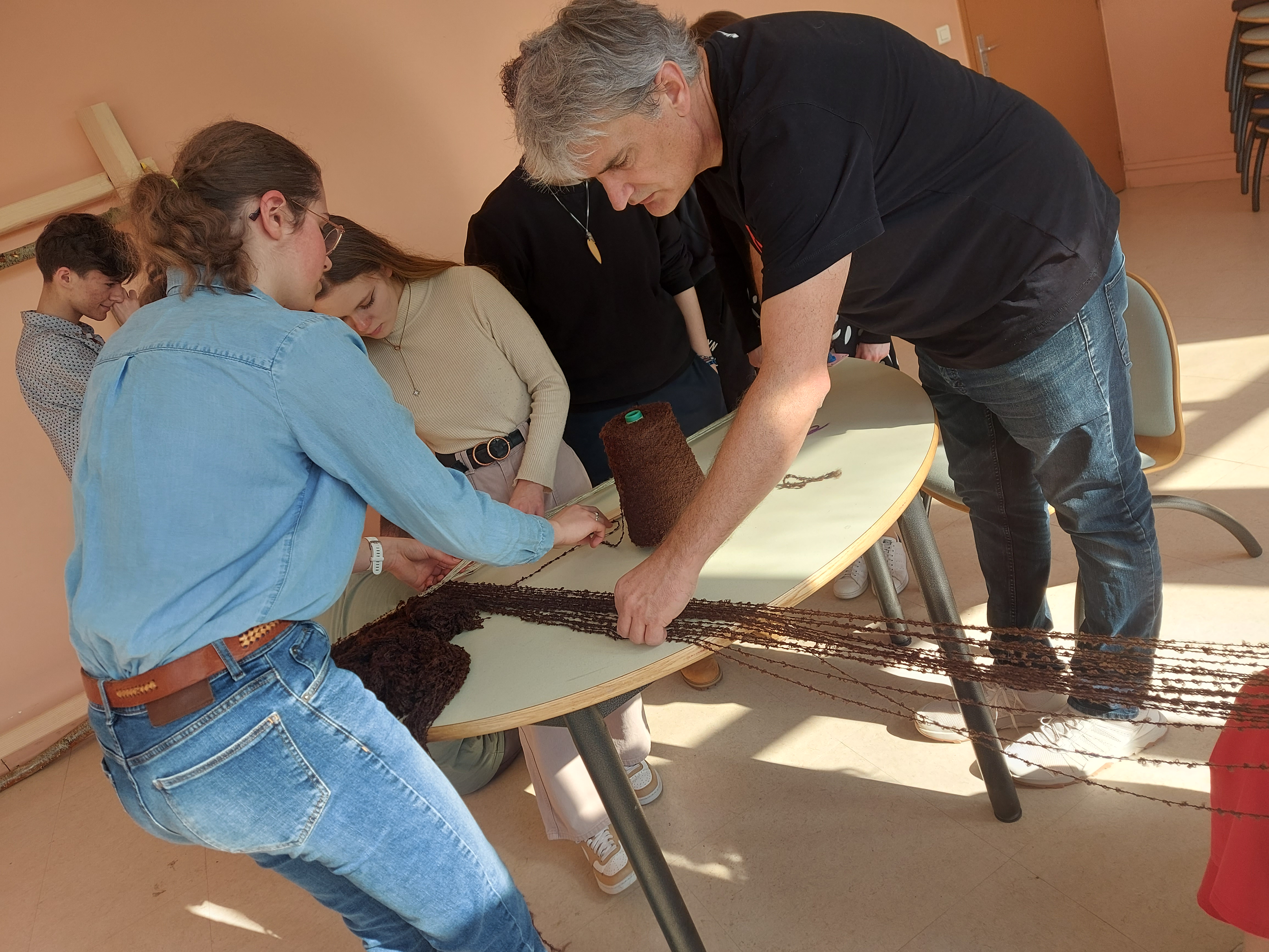Installation de la structure pour un 1er essai d'ourdissage avec les élèves sur un métier à 1 barre (le projet sera finalement plus ambitieux puisque l'année 2 partira sur un métier à tisser à 4 barres pour produire une pièce de tissu plus élaborée avec motif):