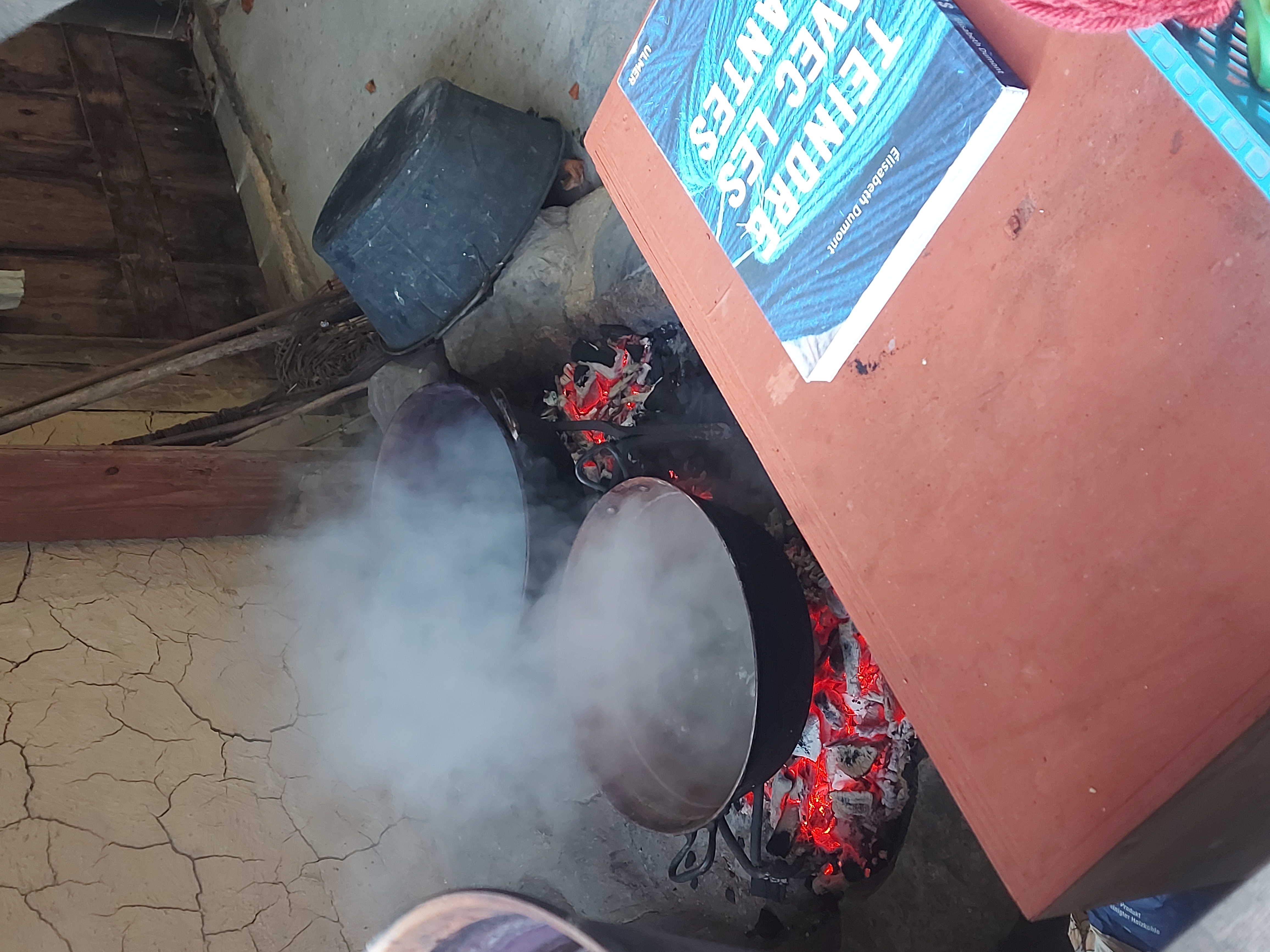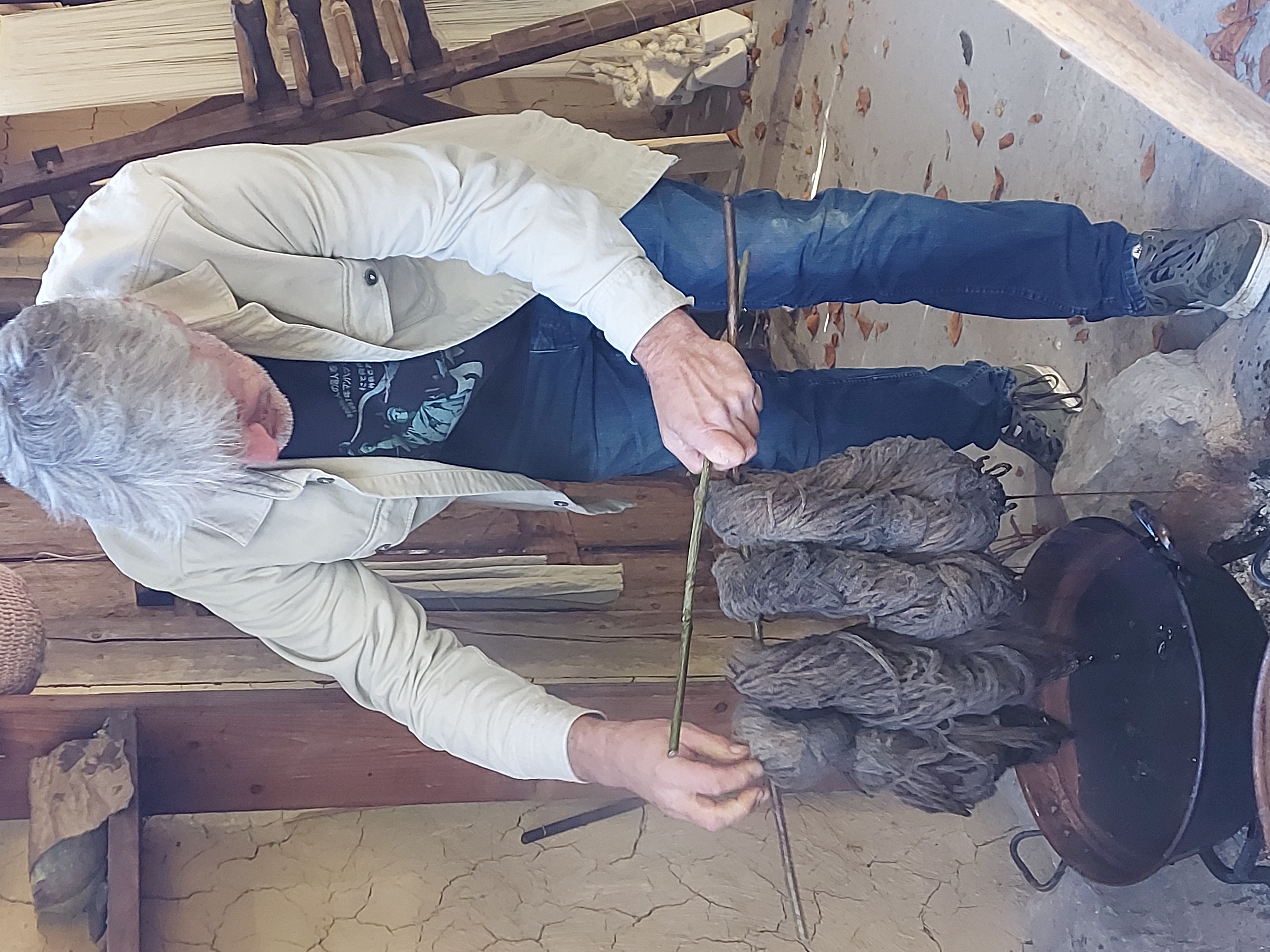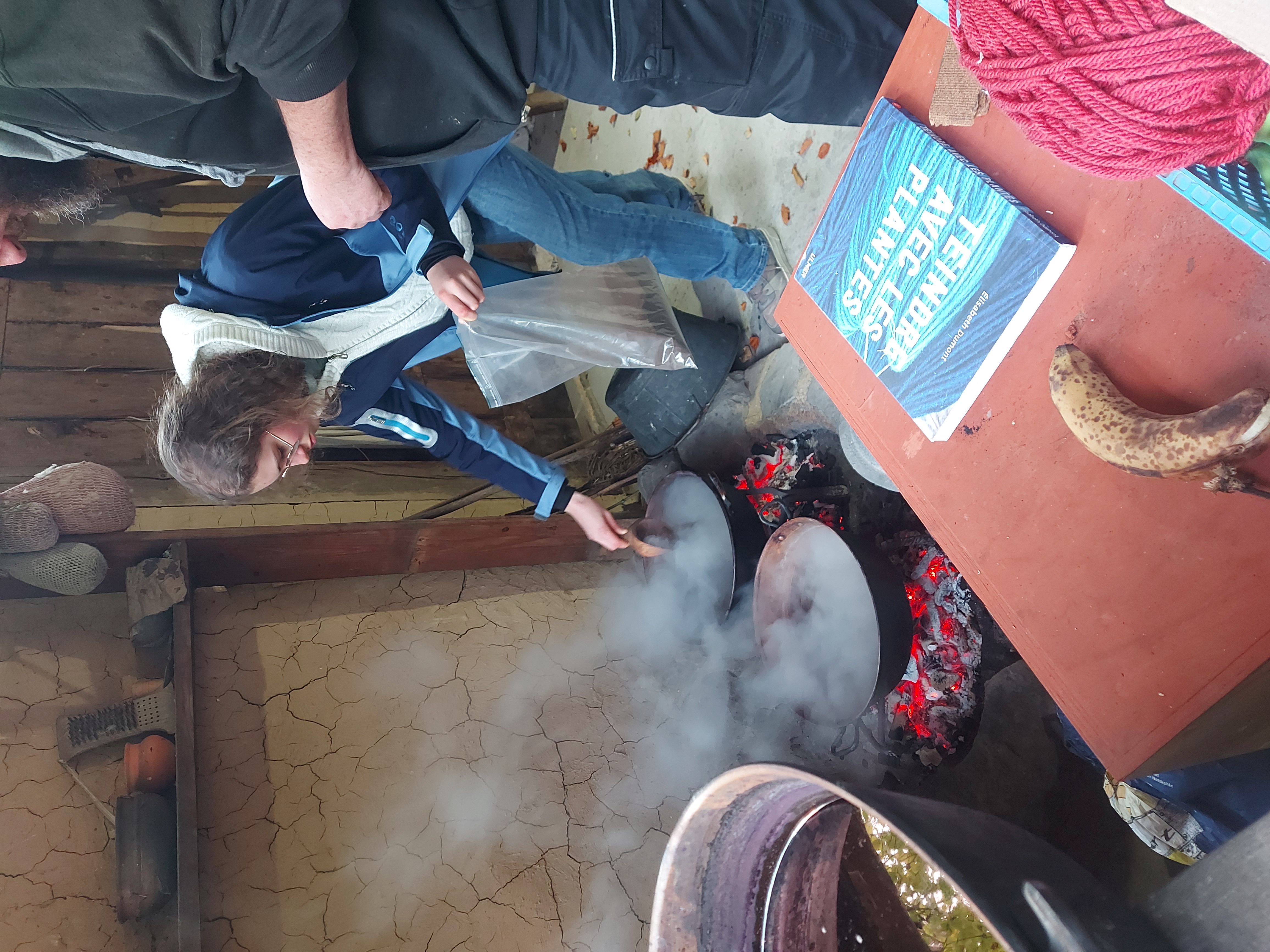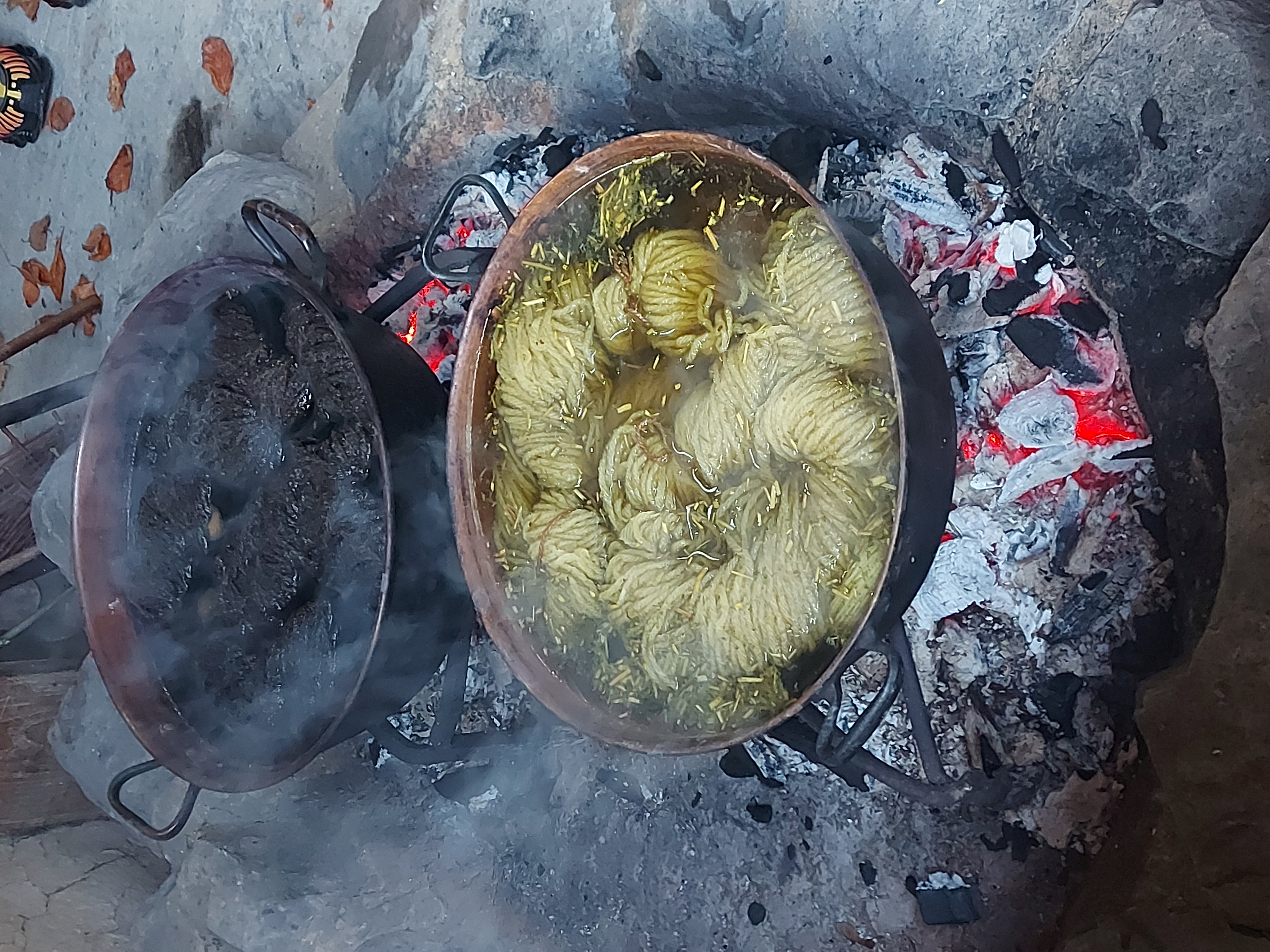 Séance sur le site de Samara: initiation aux techniques de teintures végétales: les fils qui vont être installés sur le métier à tisser pour la production finale seront ici teintés à la gaude et au brunois: